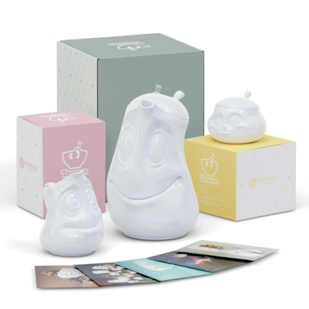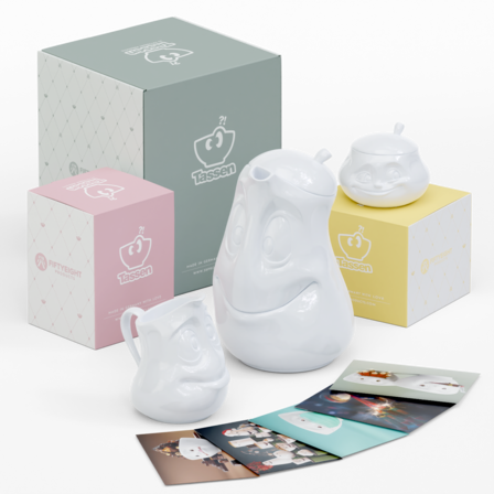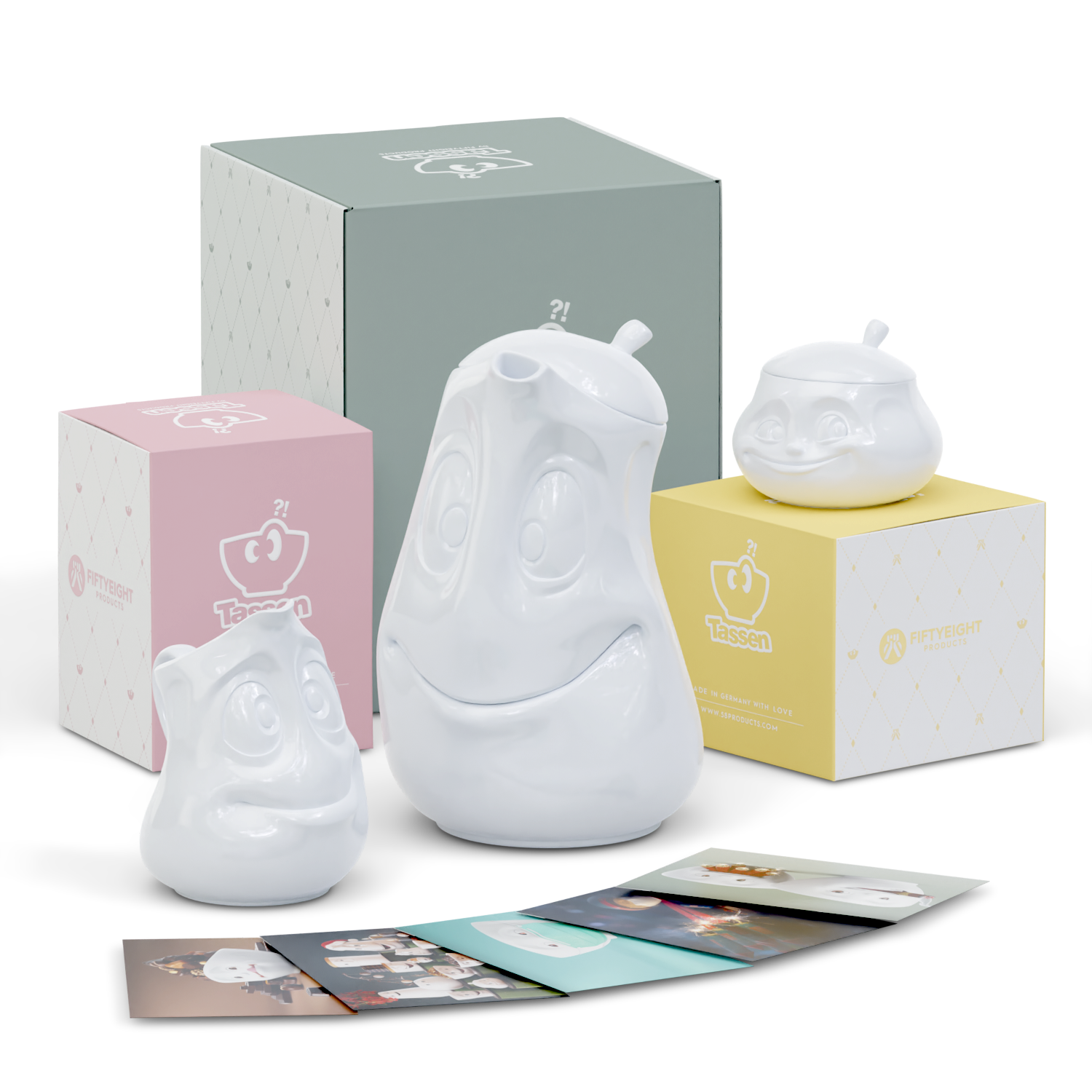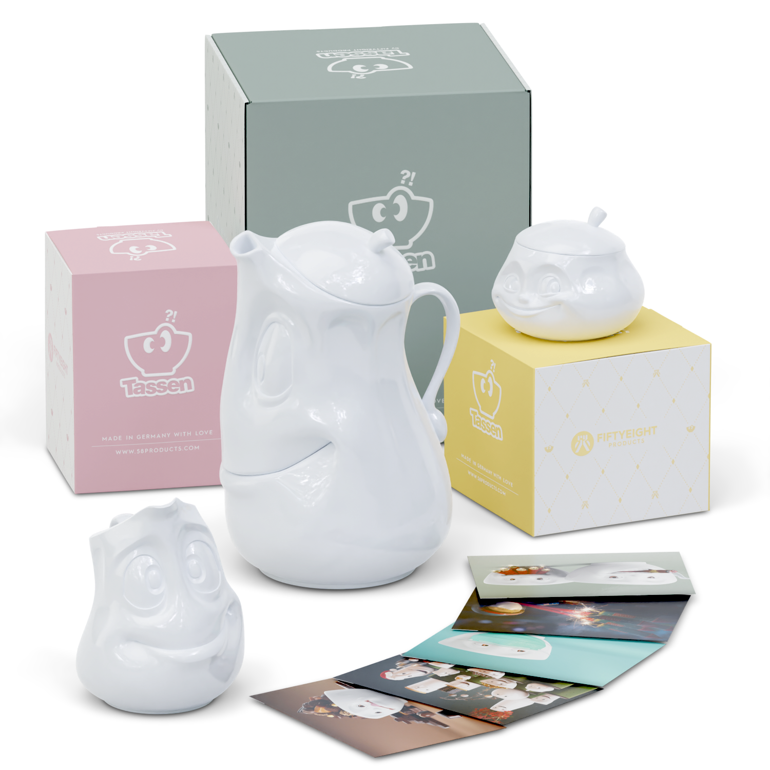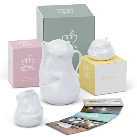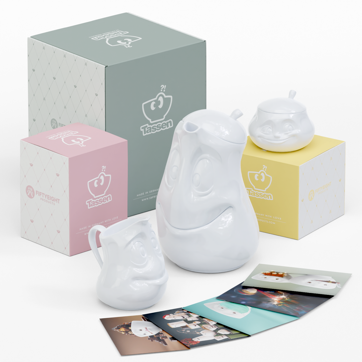 Kanne GUT DRAUF (ca. 1200 ml ), Kännchen DROLLIG, Zuckerdose SÜß + 5 Postkarten