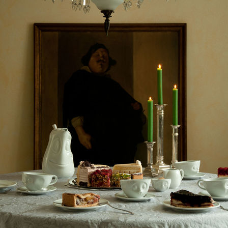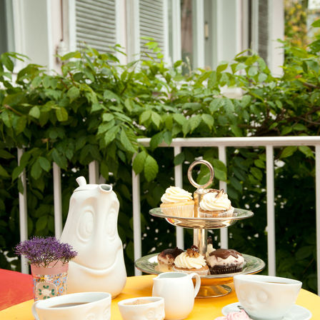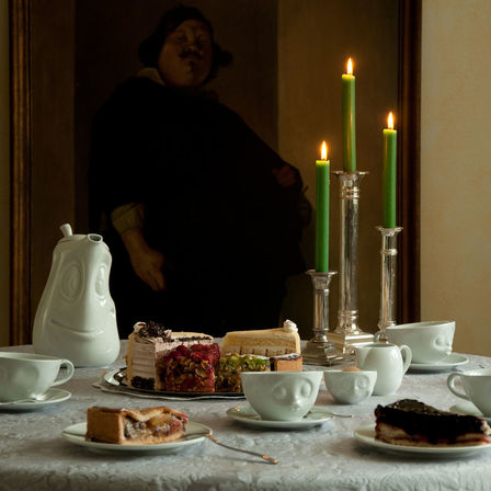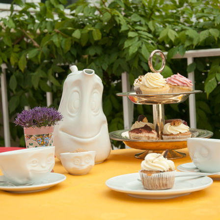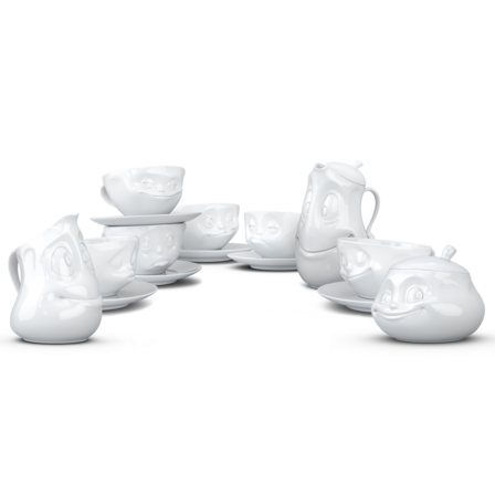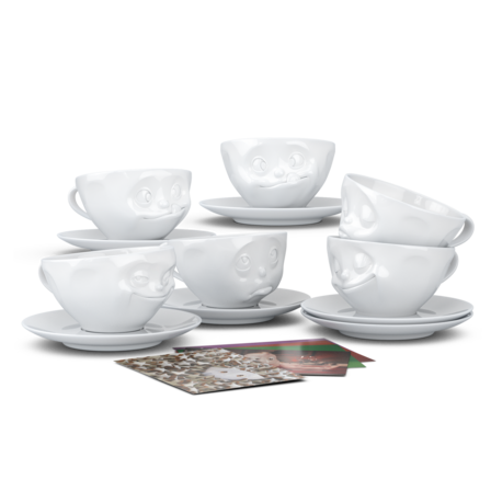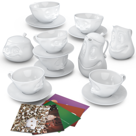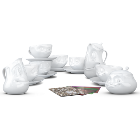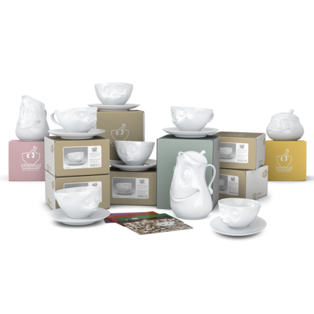 In unserem MEGA Kaffee Kränzchen erhaltet Ihr alle unsere lustigen Kaffee- oder Teetassen Gesichter, GRINSEND, KÜSSEND, GLÜCKLICH, OCH BITTE, VERPENNT und LECKER (je 200 ml), die Kanne GUT DRAUF (ca. 1,2l ), das Kännchen DROLLIG, die Zuckerdose SÜß + 5 Postkarten
