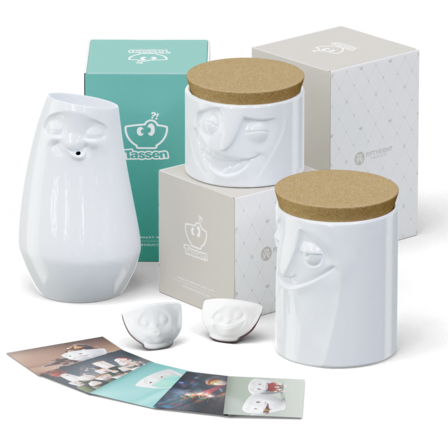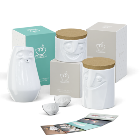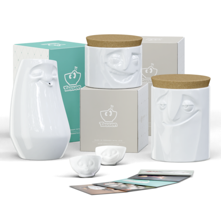 Die Party kann los gehen mit unserem Party Set bestehen aus der Vorratsdose CHARMANT, der Vorratsdose HEITER und unseren schüchteren Vase ENTSPANNT, 2 Magnete (nicht wählbar) + 5 Postkarten.