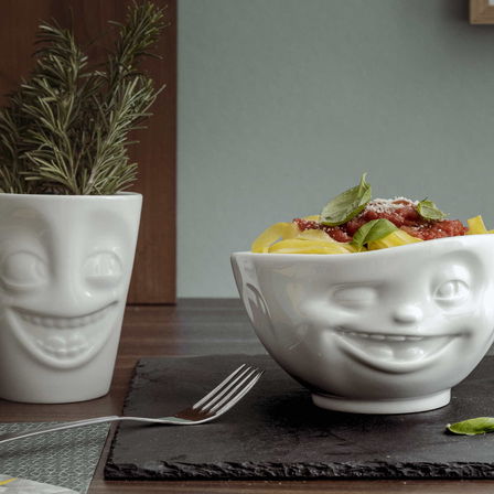 Ein weiteres fröhliches Gesicht in der Schalenkollektion bringt Freude auf Ihren gedeckten Tisch. Ihr herzhaftes Lachen und dem frechen Zwinkern steckt wahrlich an. So bekommen Müsli, Suppen, Pasta, Salate und allerlei andere Speisen eine extra Portion Würze.