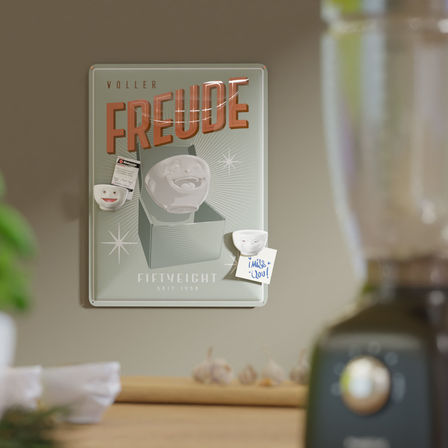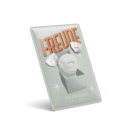 Mit dem Blechschild VOLLER FREUDE hält eine neue Produktlinie Einzug in unser TASSEN Familie. Es zeigt unsere beliebte LACHENDE Schale in klassischem Grafikdesign.