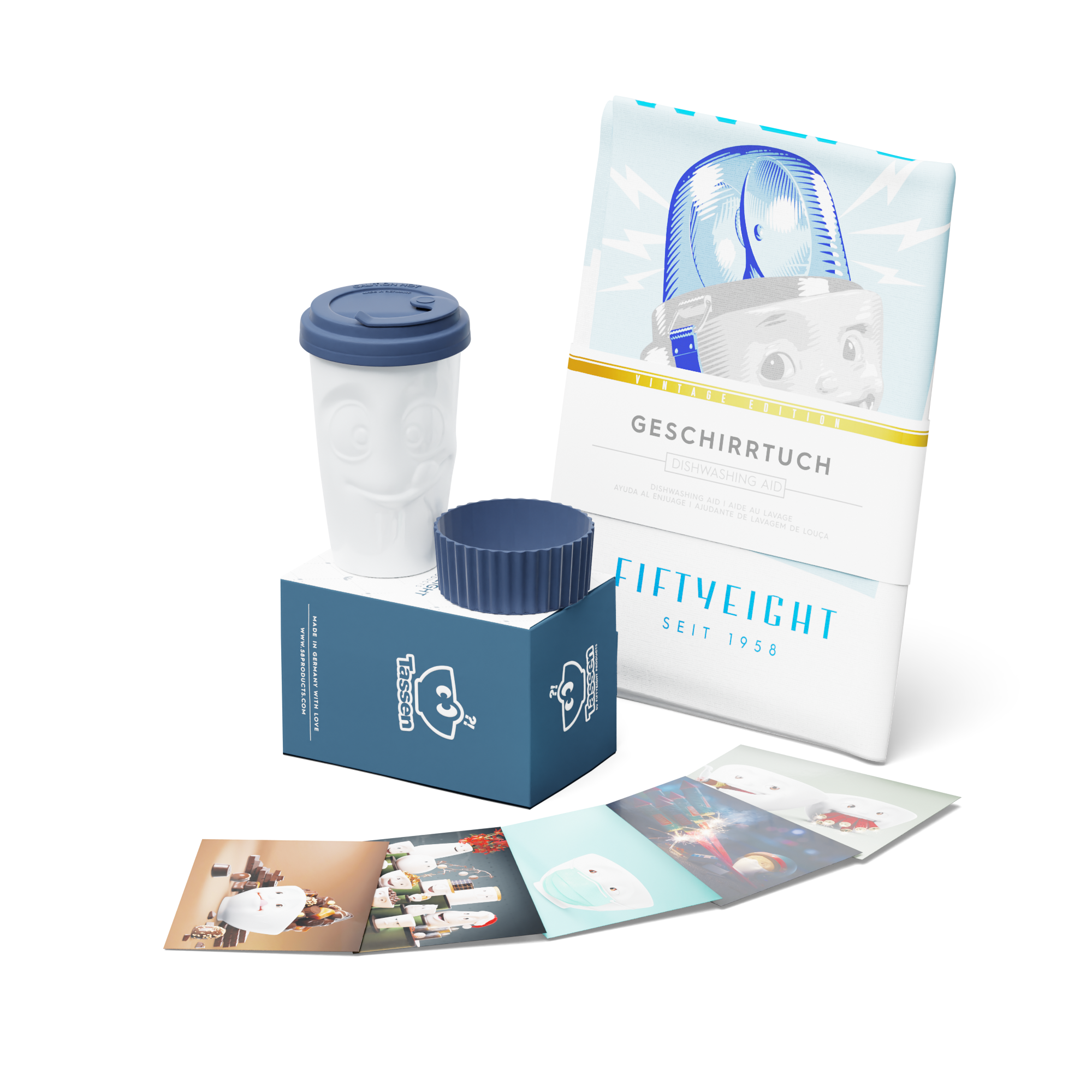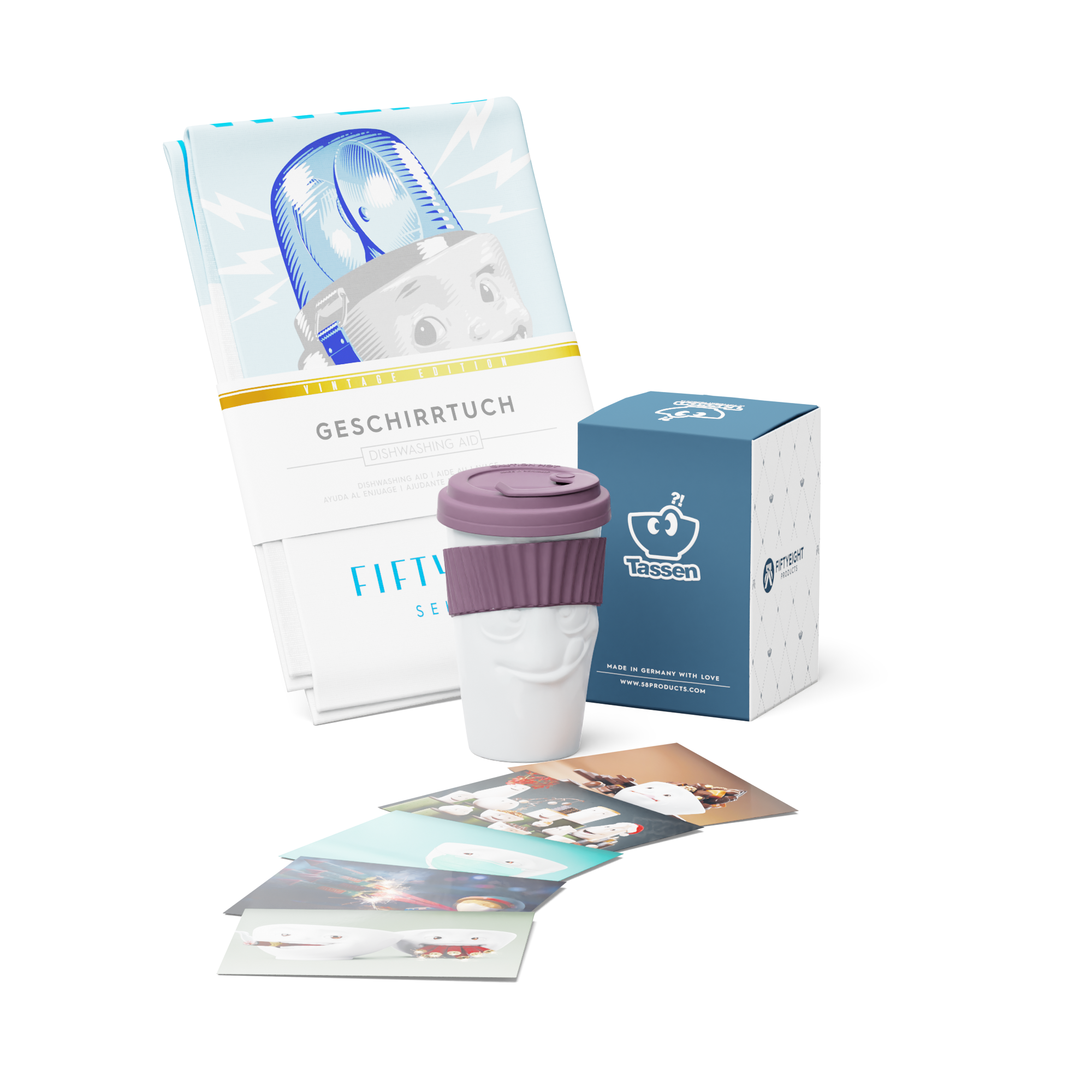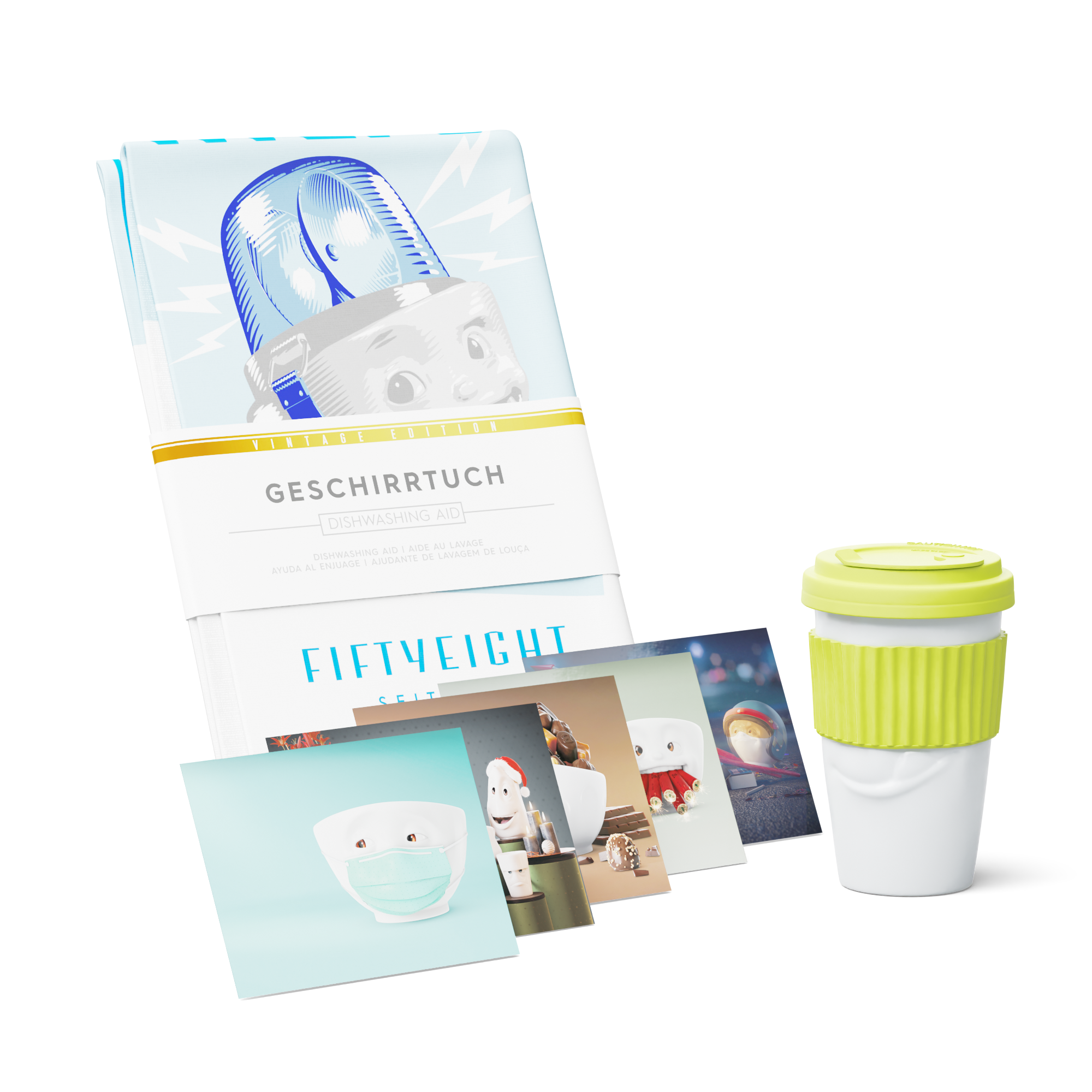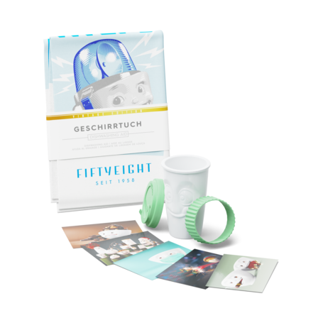 Unser Nikolaus Special Set - Go Santa Go - besteht aus unseren 2 Geschirrtüchern LECKER und SPÜL-HILFE und einem To Go Becher, frei wählbar aus den Farben, Weinbeere, Mint, Marineblau oder Limette + 5 Postkarten*.