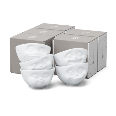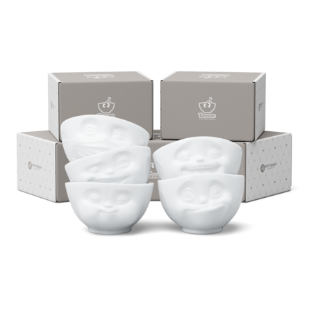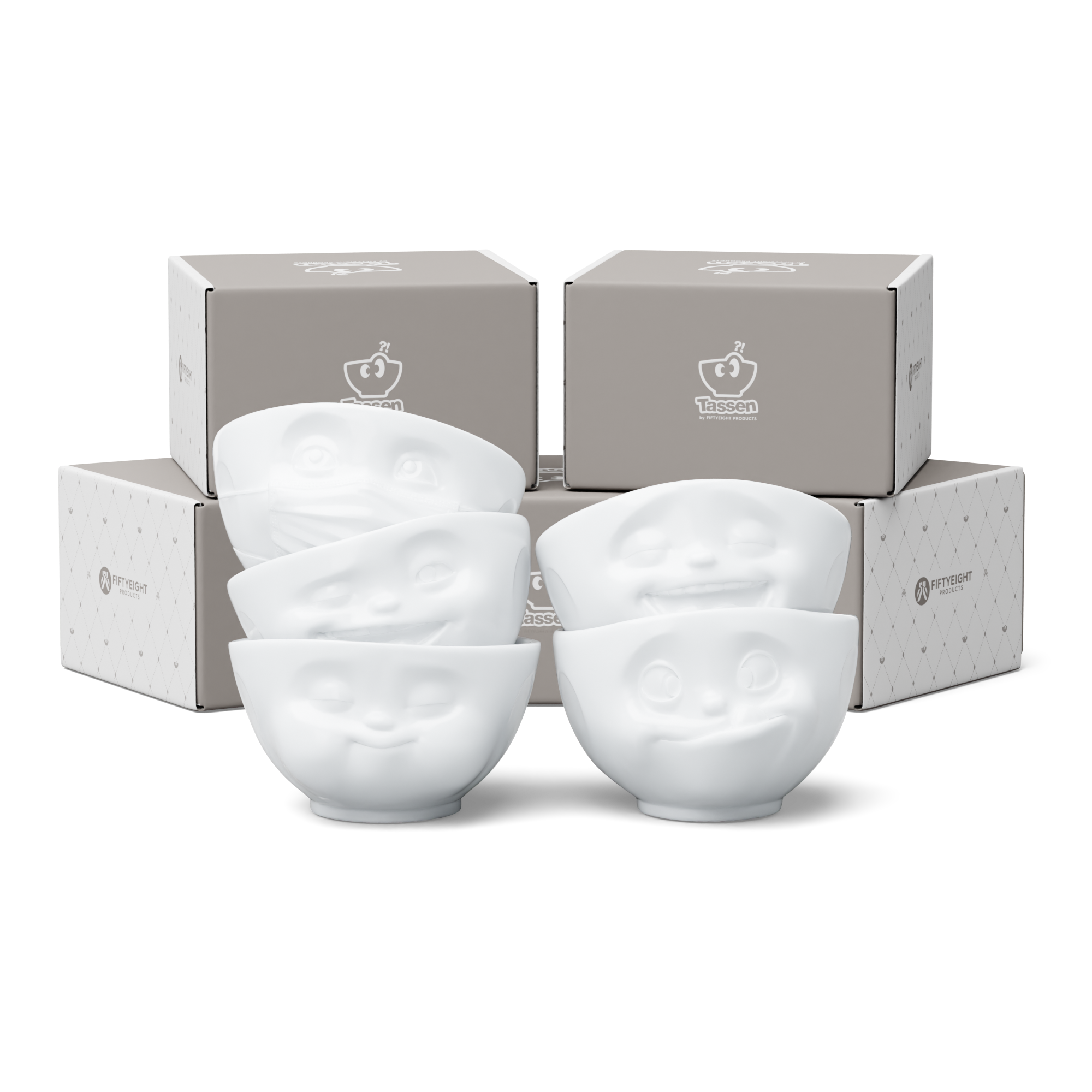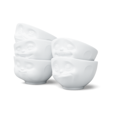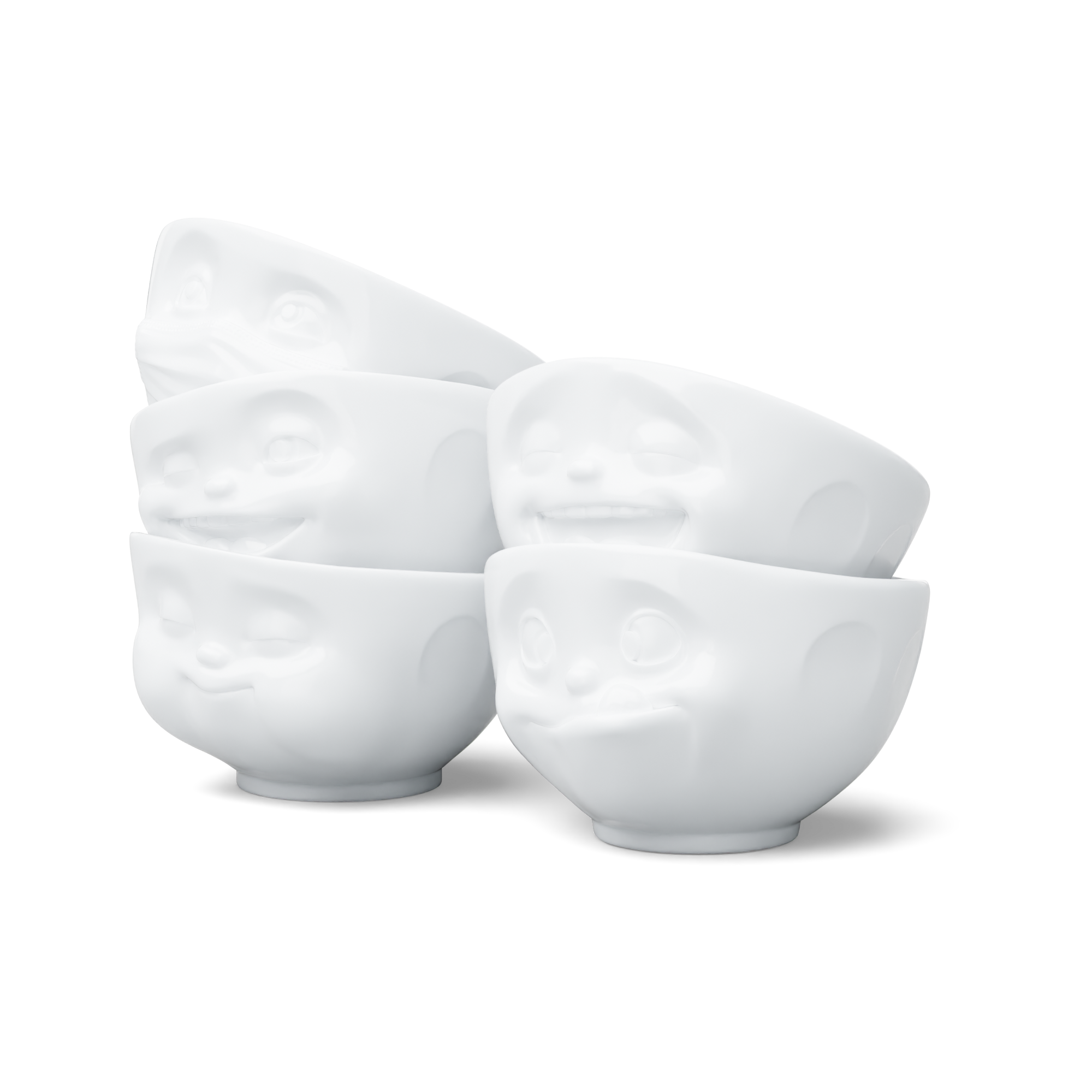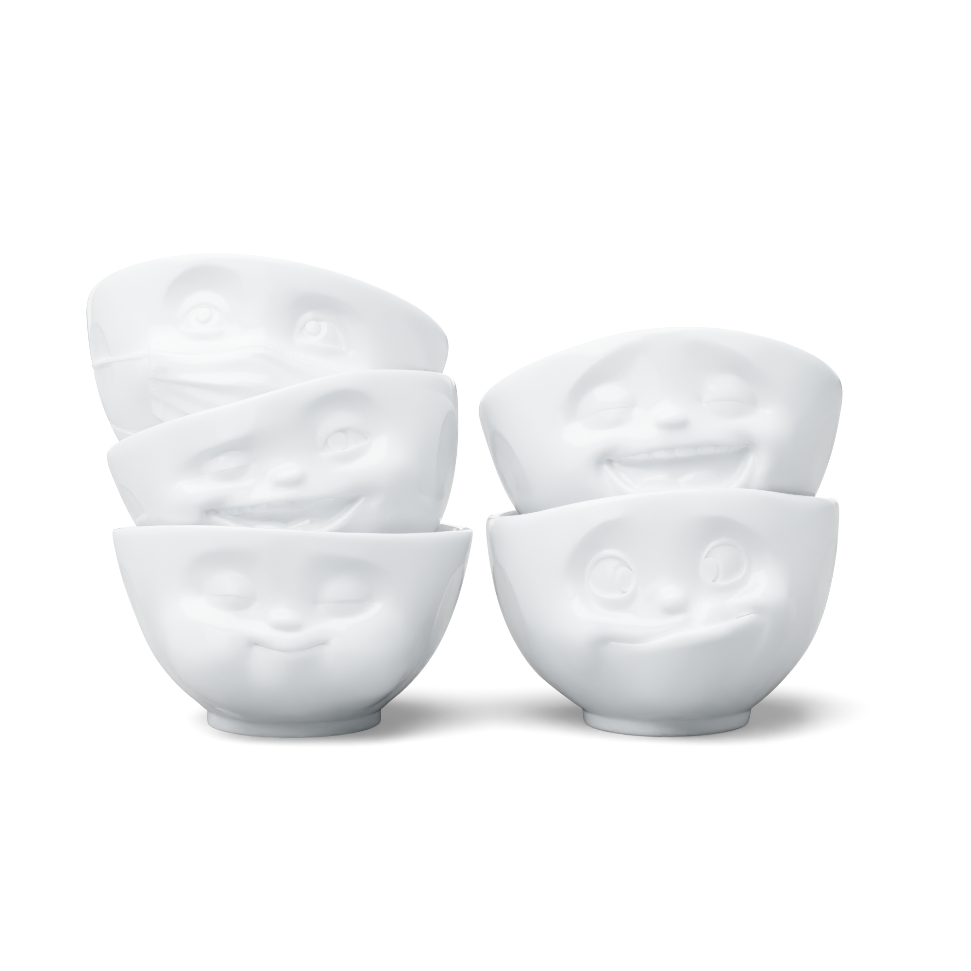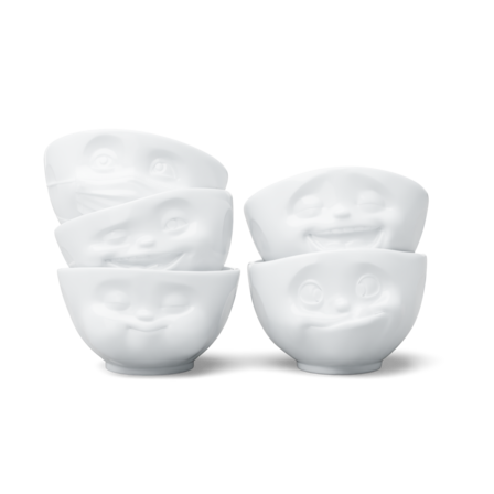 Unser 500 ml Schalen Set Nr. 2 beinhaltet die Schalen LECKER, LACHEND, ZUVERSICHTLICH, ZWINKERND, MAMPFEND + 5 Postkarten*.