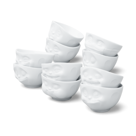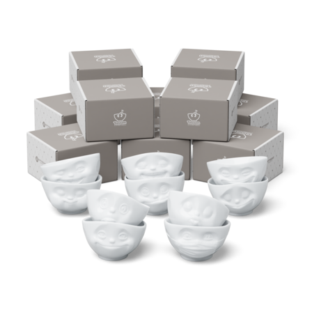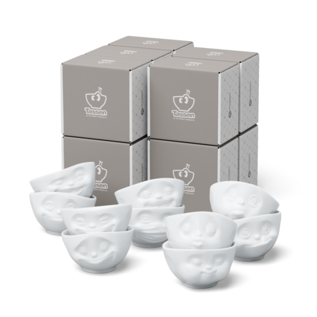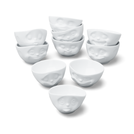 Unser Schalen Universe beinhaltet alle 10 500 ml Schalen in Weiß GRINSEND, SCHMOLLEND, KÜSSEND, GLÜCKLICH, VERTRÄUMT, LECKER, LACHEND, ZUVERSICHTLICH, ZWINKERND und MAMPFEND + 5 Postkarten*.