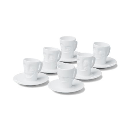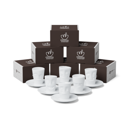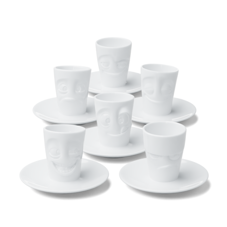 Unsere Espressorunde beinhaltet alle 6 Espresso-Mugs VERSCHMITZT, VERGNÜGT, VERDUTZT, LECKER, GRUMMELIG UND WITZIG + 5 Postkarten*