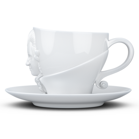 Diese exklusive Kaffeetasse mit Henkel und Unterteller aus reinem Hartporzellan besticht durch ein 3D-modelliertes Künstlerportrait mit bildhauerischer Anmutung.