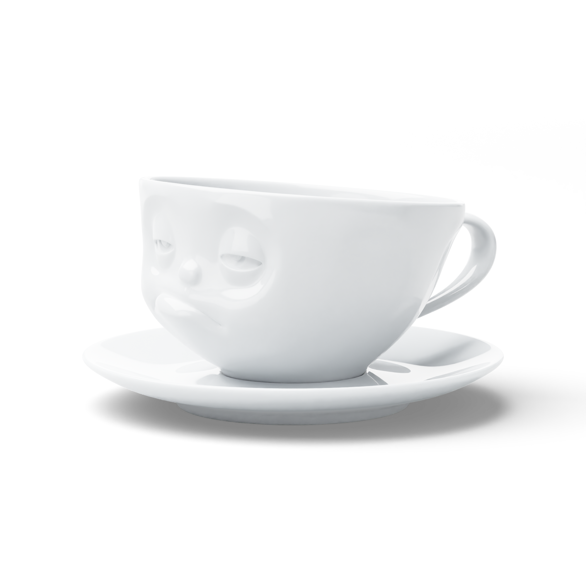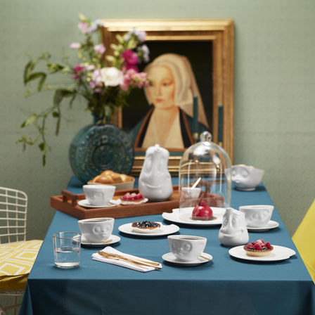 Mit Henkel und Unterteller in weiß lassen sich Kaffee, Tee und Kakao schmackhaft präsentieren.