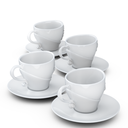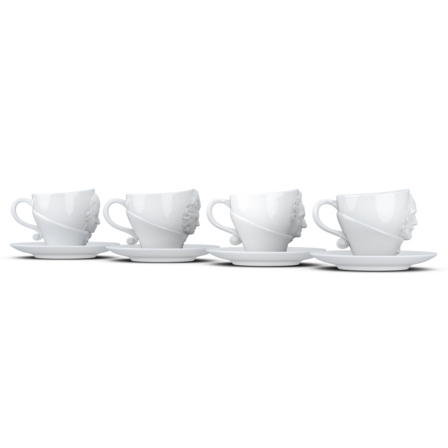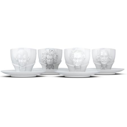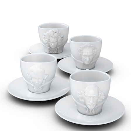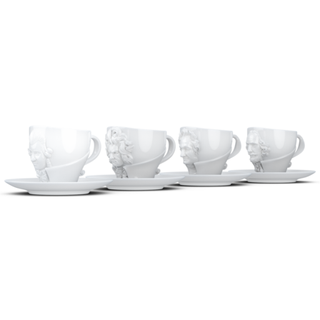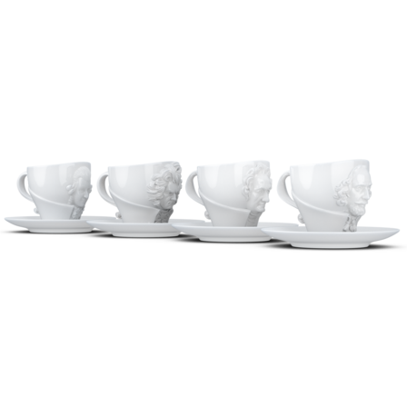 Vier exklusive Kaffeetassen mit Henkel und Unterteller aus reinem Hartporzellan, die durch 3D-modellierte Künstlerportraits mit bildhauerischer Anmutung bestechen.