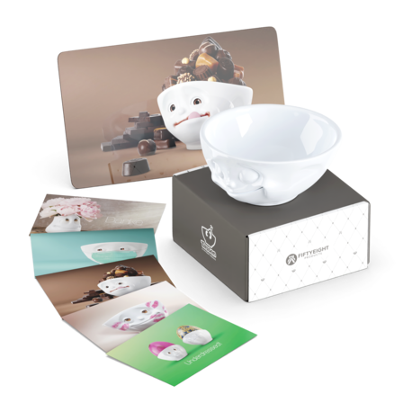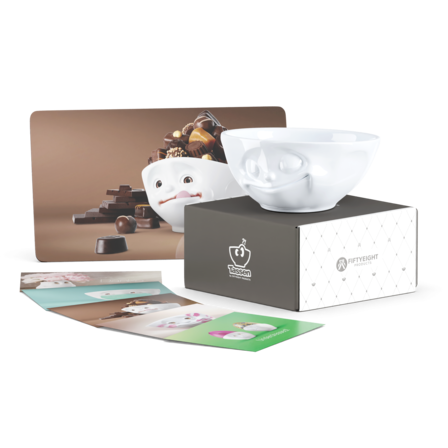 Unsere 350 ml Schale GLÜCKLICH, das Frühstücksbrettchen SWEET COCCO und 5 Postkarten.