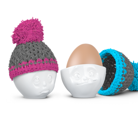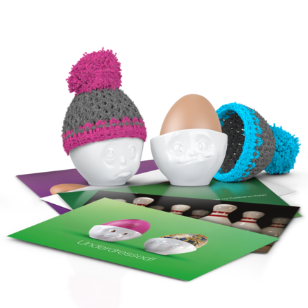 Jetzt zu Ostern gibt es auch bei uns ganz besondere Angebote. So auch das Eierbecher-Set Nr. 2 "Och bitte & Lecker" mit der türkis und magenta farbigen Mütze sowie 5 Postkarten.
