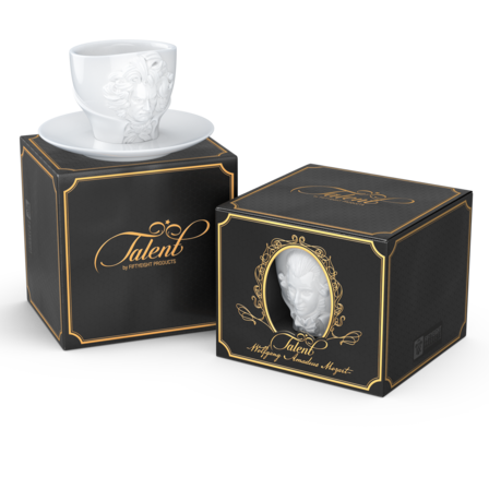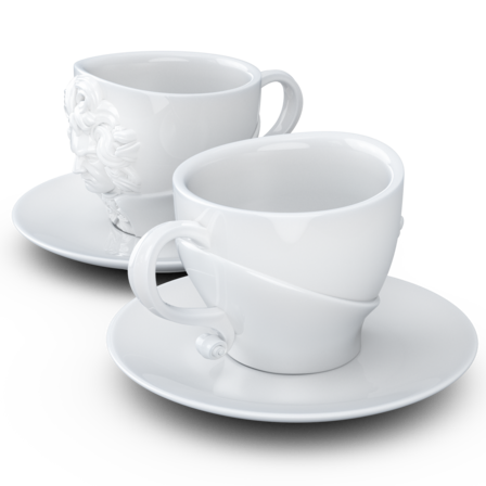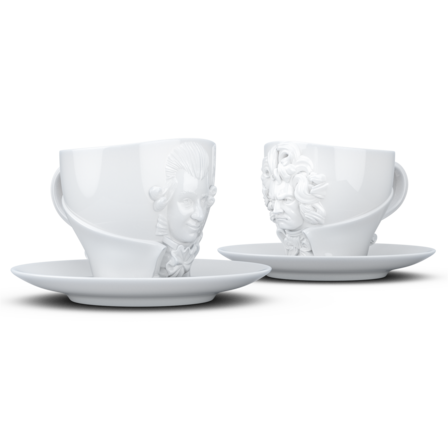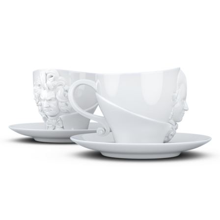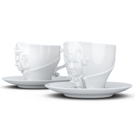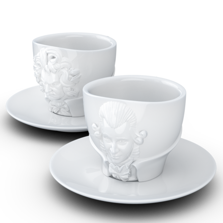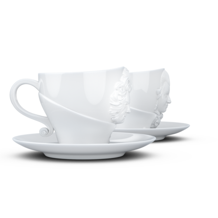 Zwei exklusive Kaffeetassen mit Henkel und Unterteller aus reinem Hartporzellan, die durch 3D-modellierte Künstlerportraits mit bildhauerischer Anmutung bestechen.