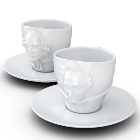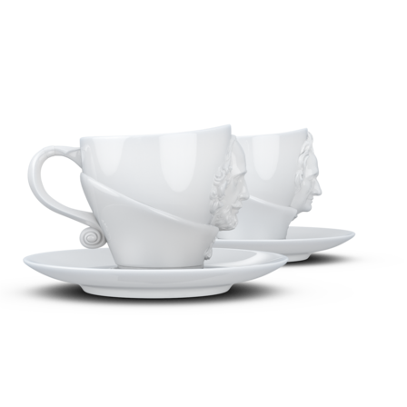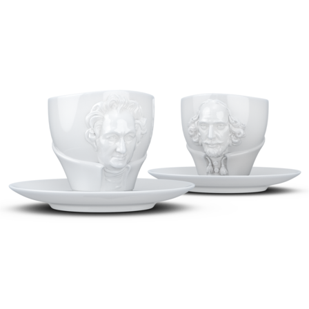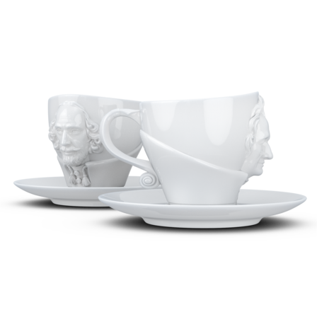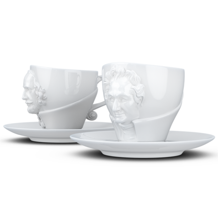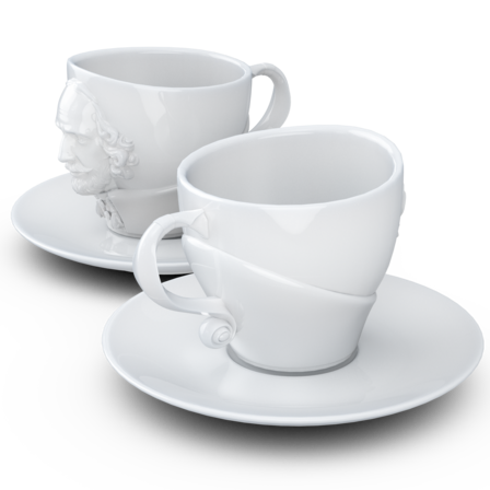 Zwei exklusive Kaffeetassen mit Henkel und Unterteller aus reinem Hartporzellan, die durch 3D-modellierte Künstlerportraits mit bildhauerischer Anmutung bestechen.