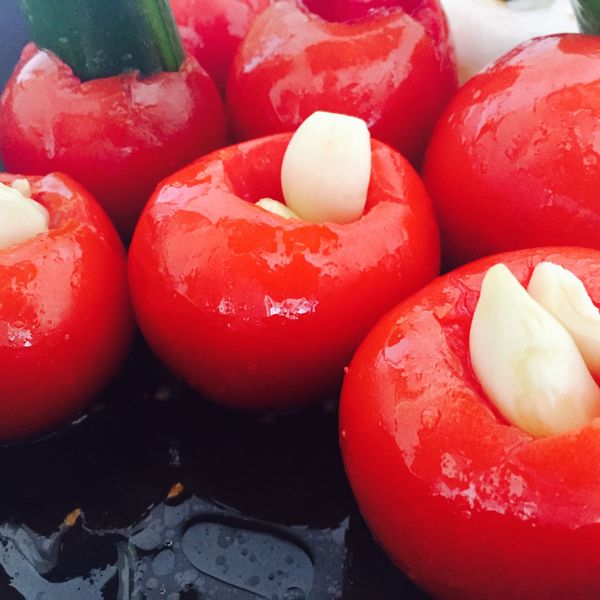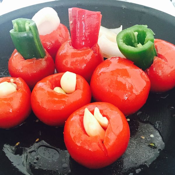 5. Die Tomaten in eine ofenfeste Pfanne oder Auflaufform geben und die Knoblauchzehen ins Innere der Tomaten (wo Stielansätze und Kerngehäuse entfernt wurden) stopfen. Auf diese Weise verbrennt der Knoblauch nicht – alter Mexikanertrick! Ebenso die Pfefferschoten und Zwiebelscheiben in die Tomaten stopfen.