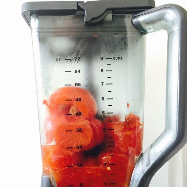8. Jetzt das geröstete Gemüse und ausgekochten Saft in einen Mixer gießen. Den Saft der Limette und Kreuzkümmel hinzugeben. Brumm! Brumm! Einige Male durchmixen, bis die Salsa den gewünschten Flüssigkeitsgrad erreicht hat.
