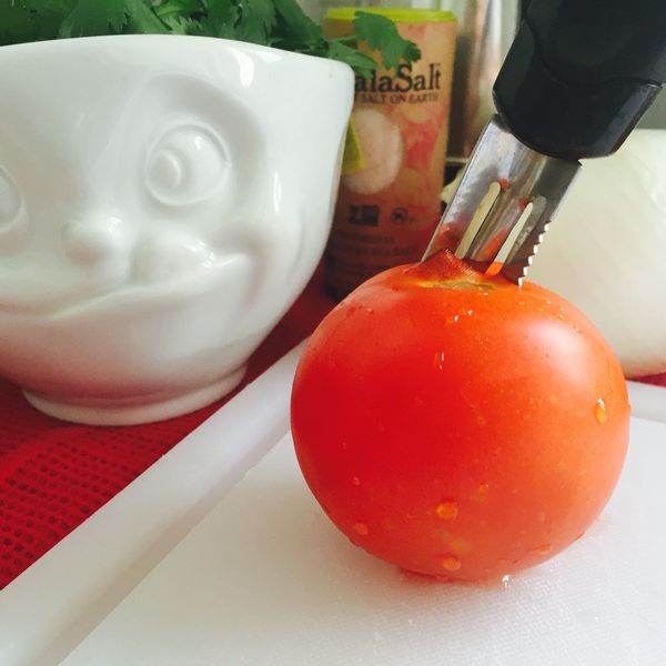 3. Stielansätze und Kerngehäuse der Tomaten entfernen. Auch bei den Pfefferschoten den Stiel entfernen und alle Saatkerne entfernen.