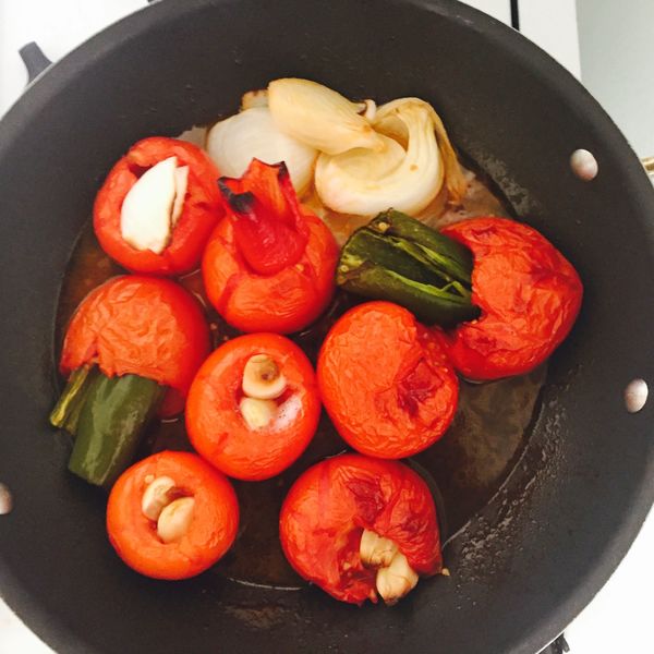 6. Jetzt wird’s heiß! Das Gemüse im Ofen bei 230C rund 30 Minuten rösten. Wenn die Haut der Pfefferschoten und Tomaten leichte Blasen aufweist, noch ein paar Minuten warten und aus dem Ofen nehmen. Ein paar angeschwärzte Stellen sind auch okay, je nachdem wie sehr „durchgeröstet“ der Geschmack sein soll.