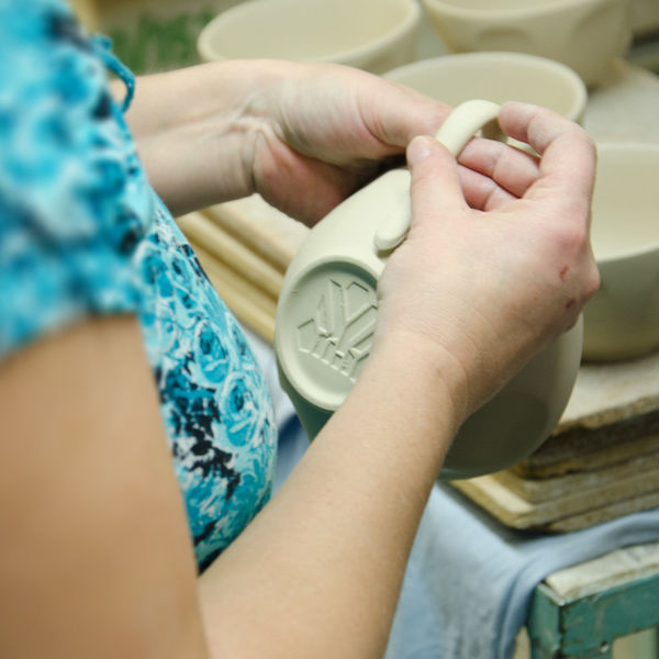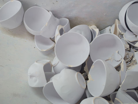 Das Endergebnis all dieser unterschiedlichen ersten Produktionsschritte ist der sogenannte „Scherben“ aus trockenem Porzellan, der anschließend in den Brennofen wandert. Beim ersten Brand wird die Rohware bei ca. 950º C verfestigt und anschließend mit einer Glasur versehen. Beim zweiten Brand, dem sogenannten Glattbrand bei 1420º C, wird der Scherben glatt gebrannt. Hierbei „sintern“ die Materialbestandteile – sie verschmelzen – und der Scherben wird dicht, was zur Verwendung mit Lebensmitteln unersetzlich ist. Somit ist das Weißporzellan fertig und das Produkt geht zum Schleifen und Sortieren nach Qualitätsgrad.